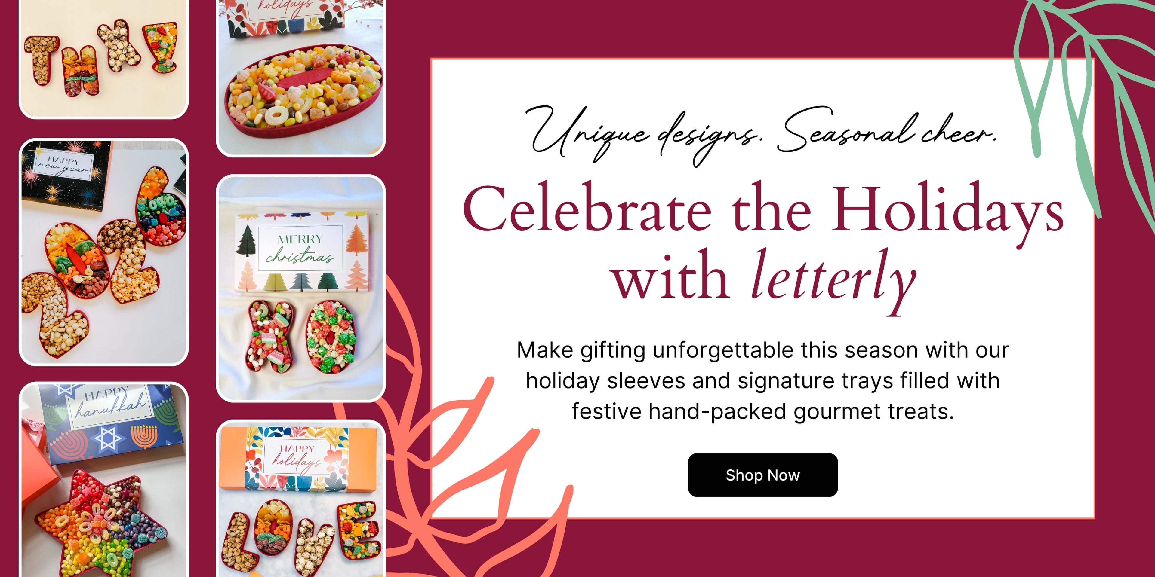 Celebrate every moment with custom holiday sleeves — Happy Holidays, Merry Christmas, Happy Hanukkah, and Happy New Year —paired with our one-of-a-kind gourmet sweets and seasonal delights.