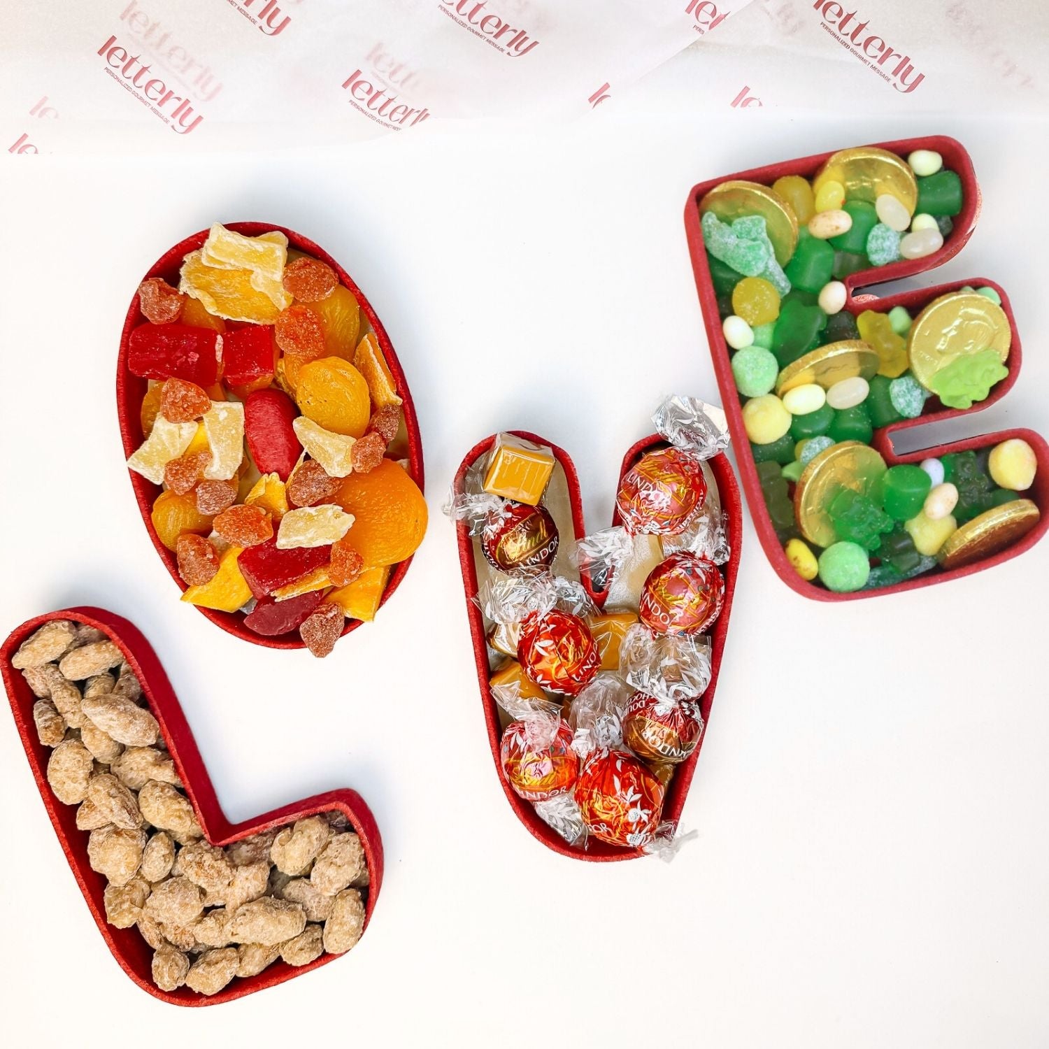 Includes four trays spelling LOVE, beautifully arranged and ready to gift
