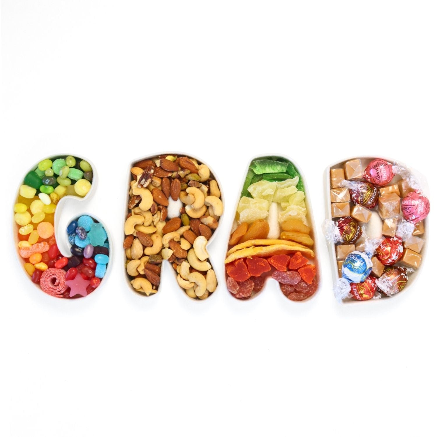 Our “GRAD” Graduation Tray is a handcrafted, eco-friendly statement piece designed to celebrate their moment in the sweetest way. Each letter is filled with your choice of premium gourmet treats — from decadent chocolates and colorful candy (vegan options available) to crunchy mixed nuts and naturally sweet dried fruits.