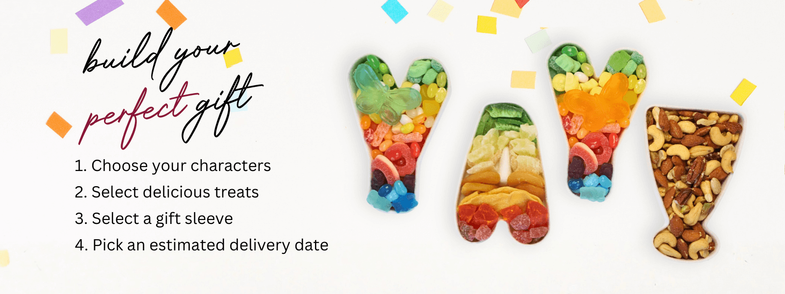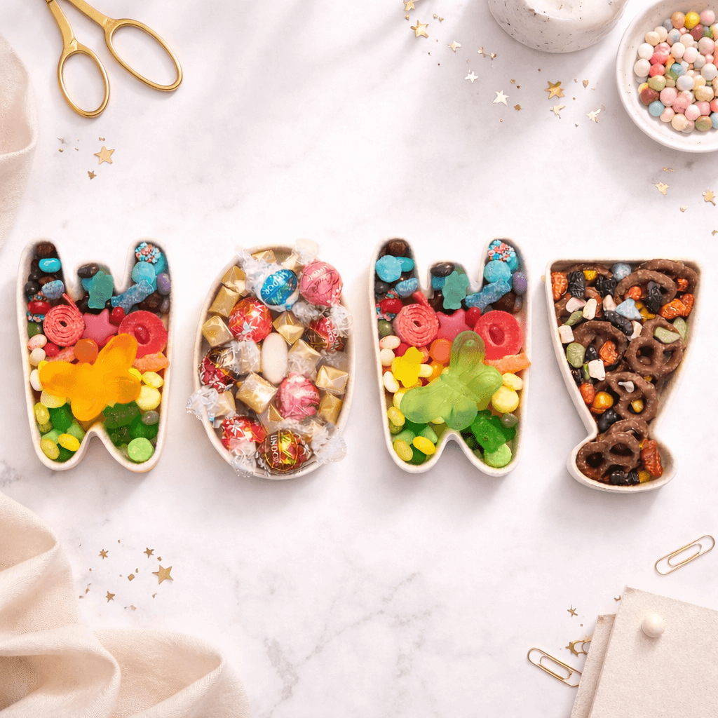 From “SORRY” to “PARTY” to a full set of initials, our 5 character gifting tray transforms words into something edible, giftable, and unforgettable.