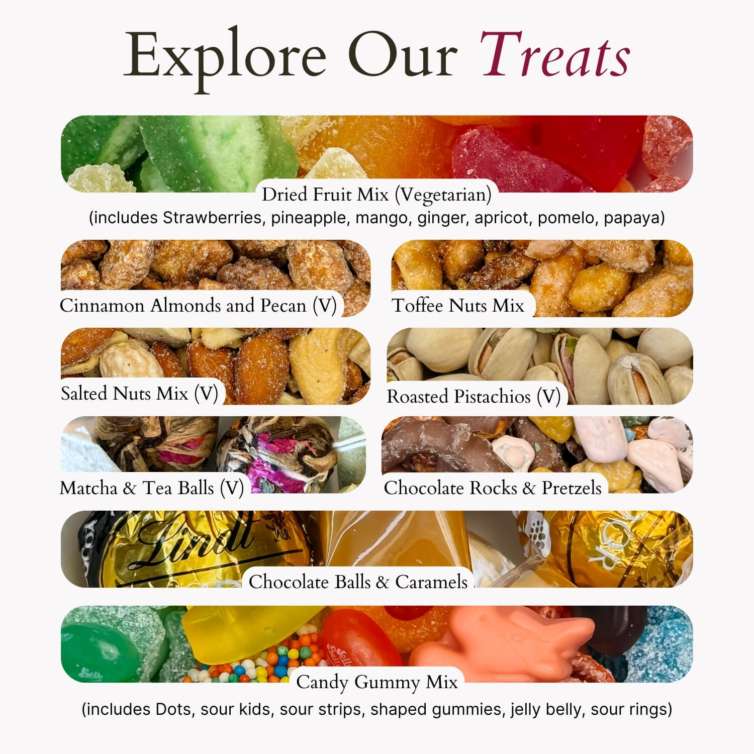 We curate only the finest, artisan-quality treats to elevate your gifting experience. Our selections include: