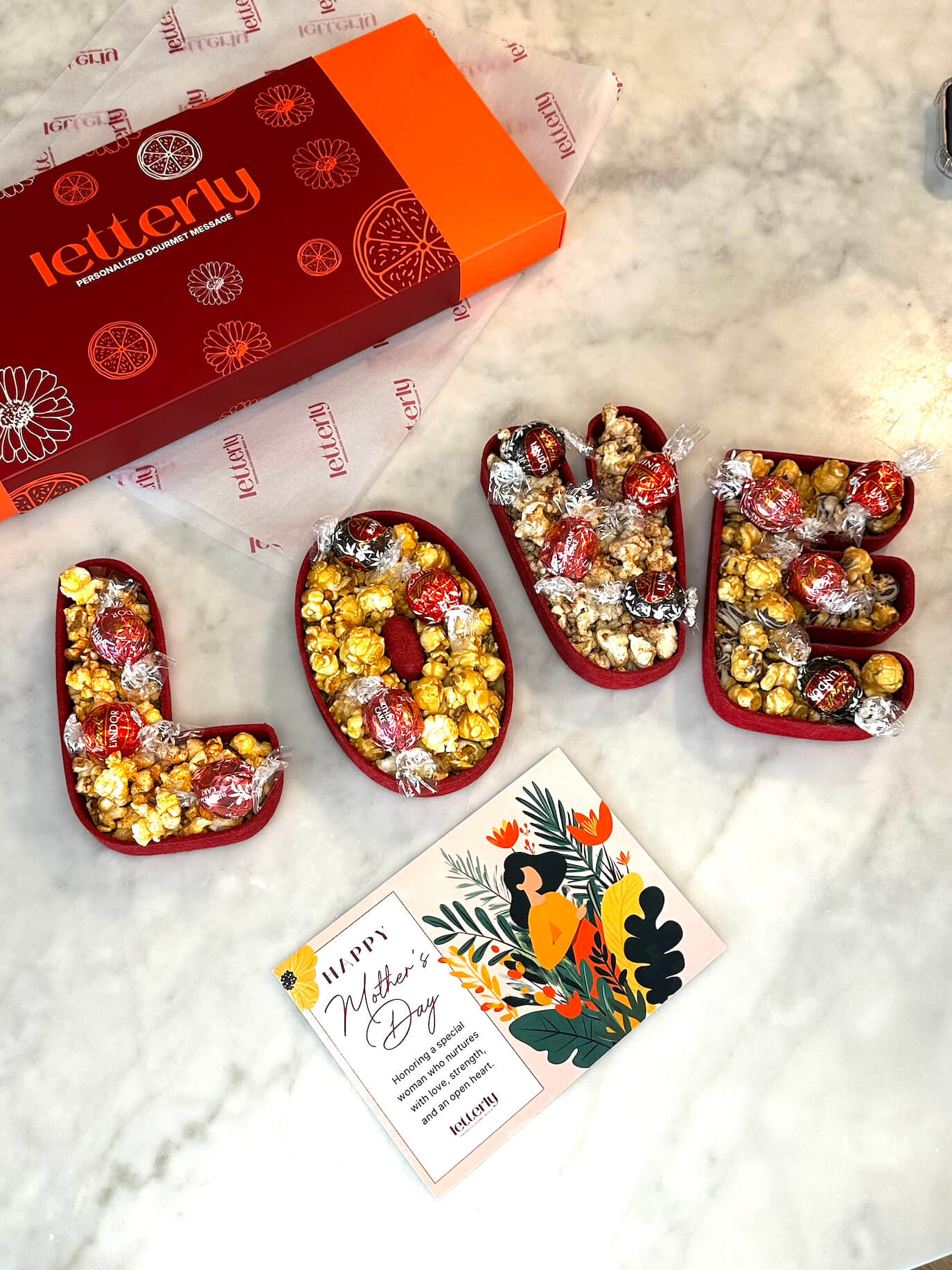 Make your message unforgettable with our LOVE gourmet gift box—a modern expression of care, celebration, sympathy, or romance. Each letter is crafted into a sleek, eco-friendly tray and filled with premium treats like gourmet candy, chocolates, or dried fruits and nuts.