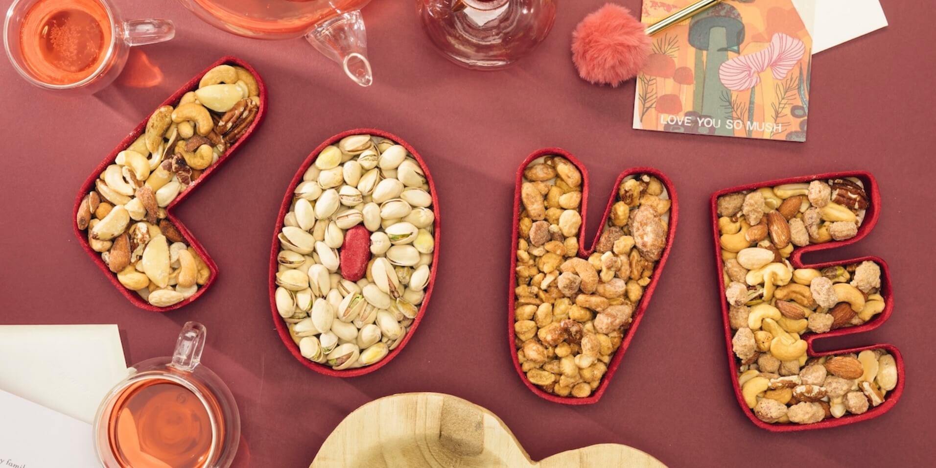 Fillings: Festive Valentine's Day candy, gourmet chocolates, popcorn, dried fruits, nuts, green matcha tea and tea bomb balls (vegan options available)